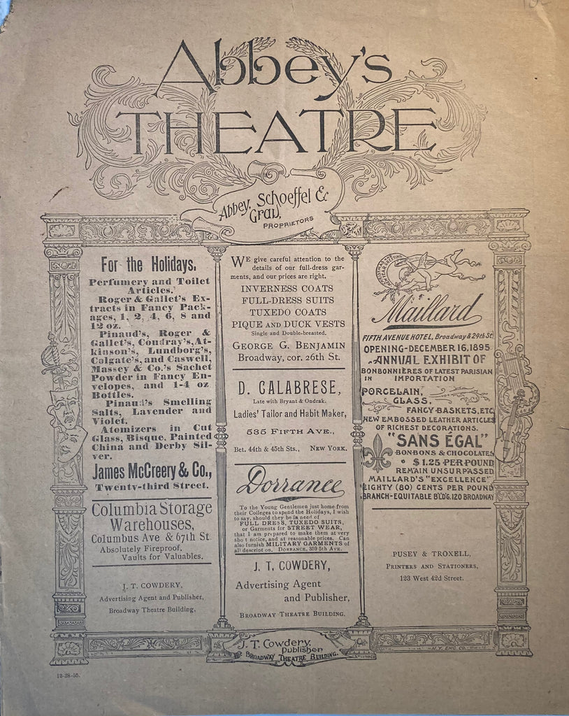 Abbey's Theatre, NY. "The Notorious Mrs. Ebbsmith." Dec. 23, 1895. 4to. 8pp., prof illust w/ bicycle ads. Illust wraps, printed on tan stock, somewhat brittle, Fair.