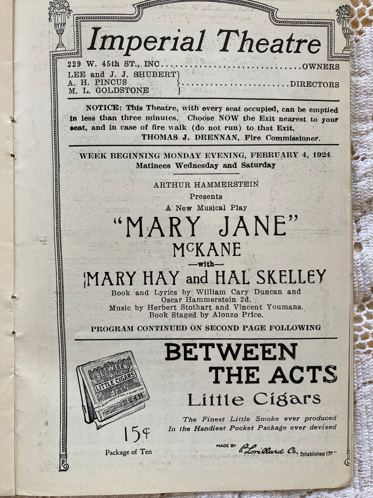 Imperial Theatre, NY. "Mary Jane." Feb. 4, 1924.