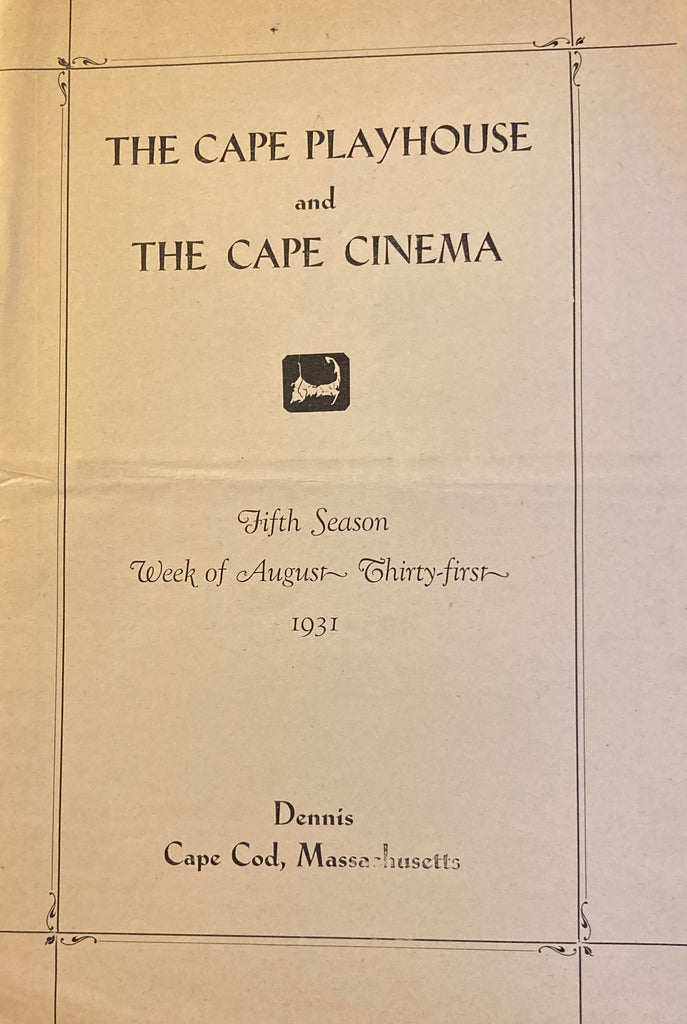 The Cape Playhouse and The Cape Cinema, Dennis, MA. "A Golden Cinderella." Fifth Season, Aug. 31, 1931. Lge 8vo. 8pp., lots of local ads. Printed wraps, covers lightly stained, tiny tears, else Fair+. Collectible. Includes announcement for times for the upcoming film, "The Unholy Garden" starring Ronald Colman. The Cape Cinema is well known for its beautiful Art Deco architecture, as well as murals by Rockwell Kent.