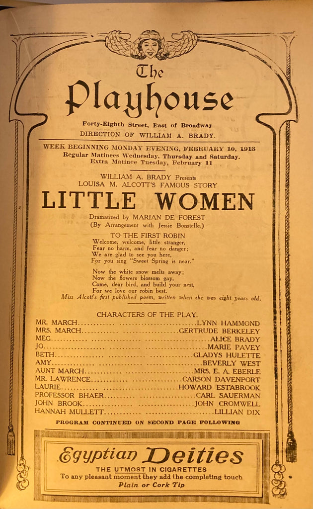 The Playhouse Theatre, NY. "Little Women." Feb. 10, 1913. 8vo. 32pp., prof illust w/ ads inc local restaurants. Color illust wraps, sm scuff to front cover, covers somewhat embrowned, else Fair+.