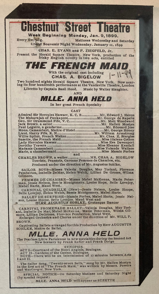 (Leaflet & Postcard) Chestnut Street Theatre, Phila. Anna Held starring in "The French Maid." Jan. 9, 1899.