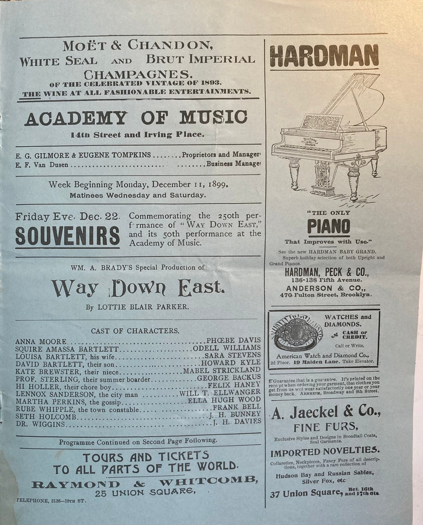 Academy of Music, NY. "Way Down East." Dec. 11, 1899.