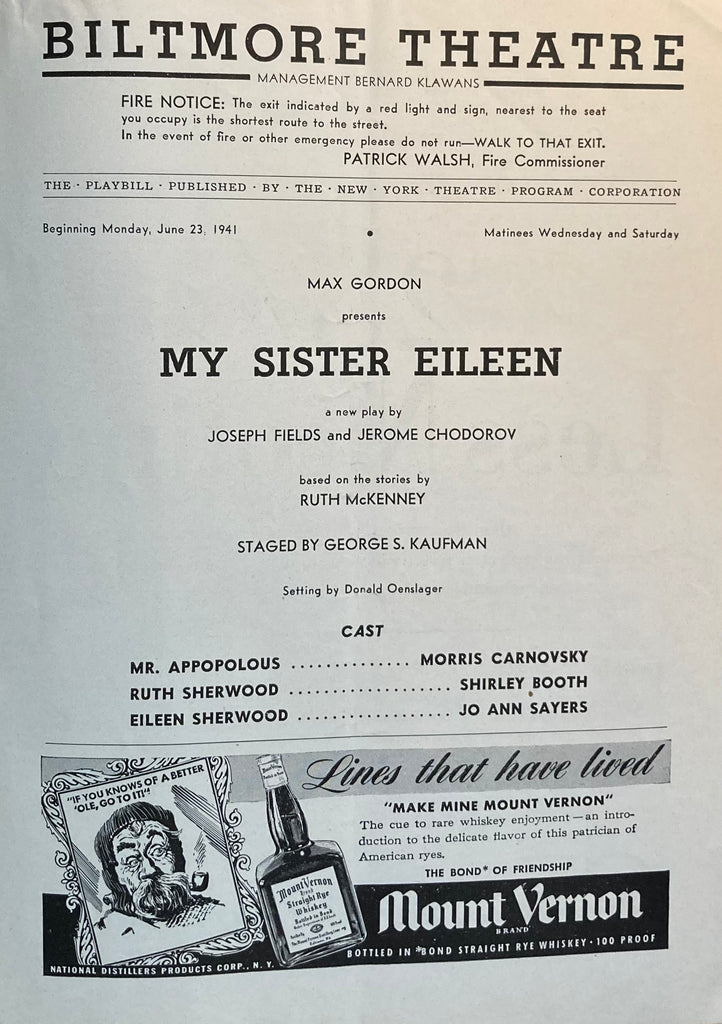 Biltmore Theatre, NY. "My Sister Eileen." June 23, 1941. 8vo. 20pp., prof illust w/ ads inc local restaurants. Illust wraps., lightly rubbed, else Good.