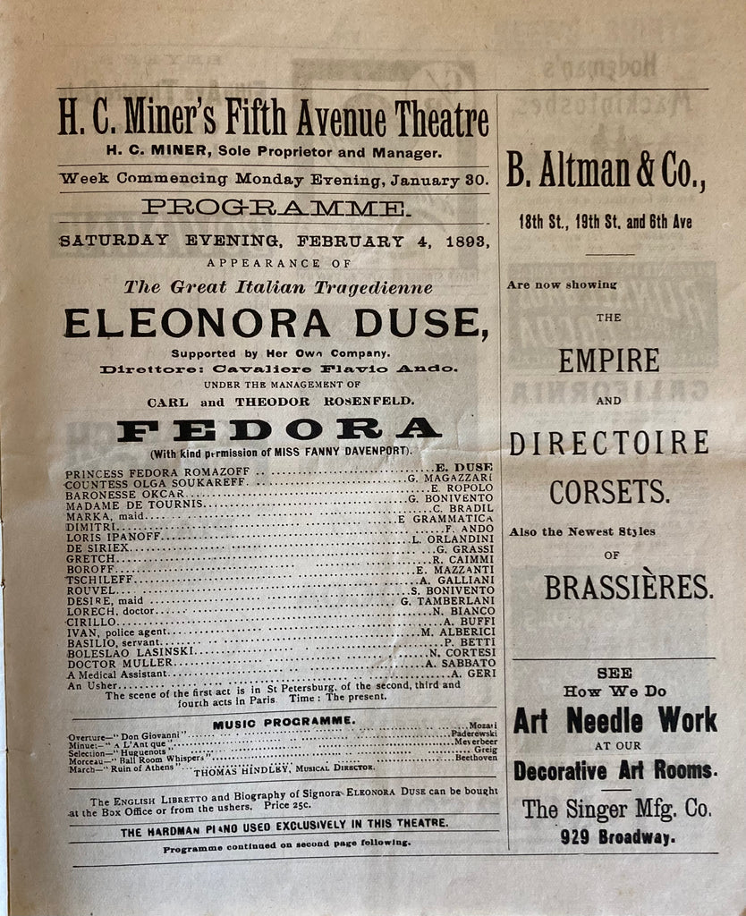 Fifth Avenue Theatre, NY. Eleonora Duse in "Fedora." Feb. 4, 1893.