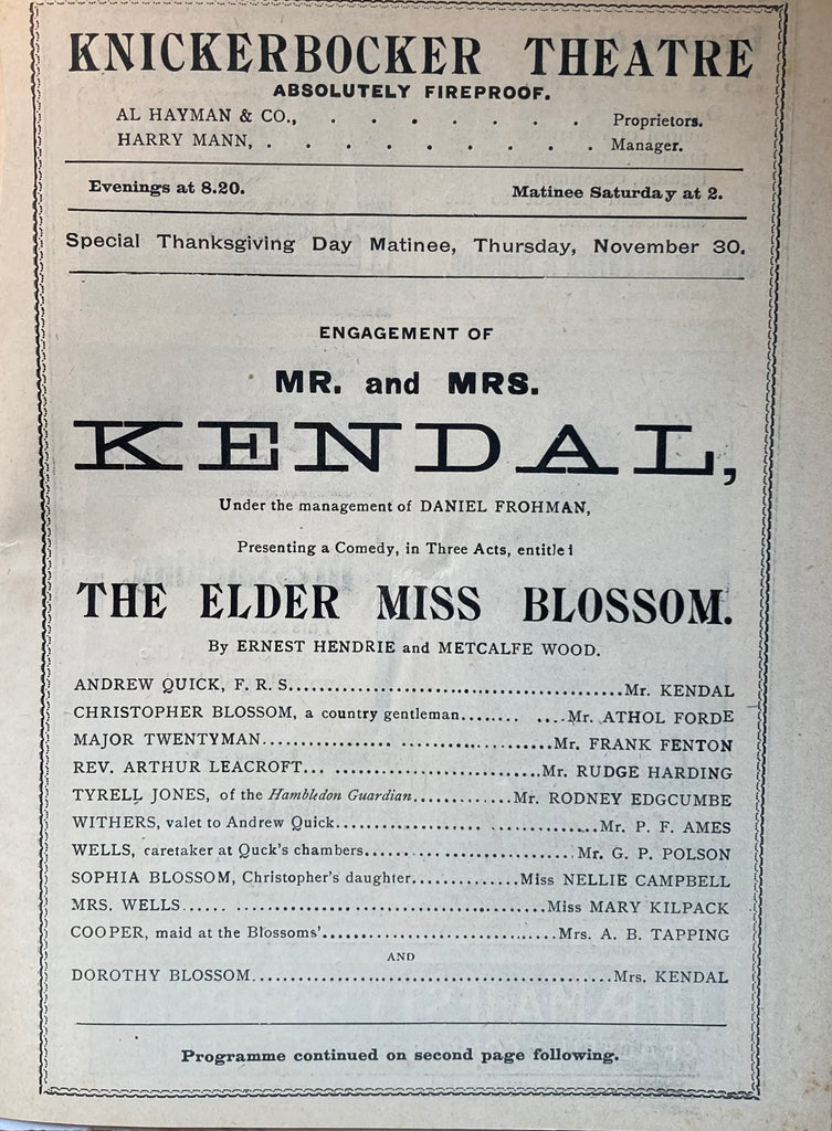 Knickerbocker Theatre, NY. Mr. and Mrs. Kendal in "The Elder Miss Blossom." Nov. 20, 1899. 8vo. 36pp., prof illust w/ ads inc. restaurants. Illust wraps, Good.