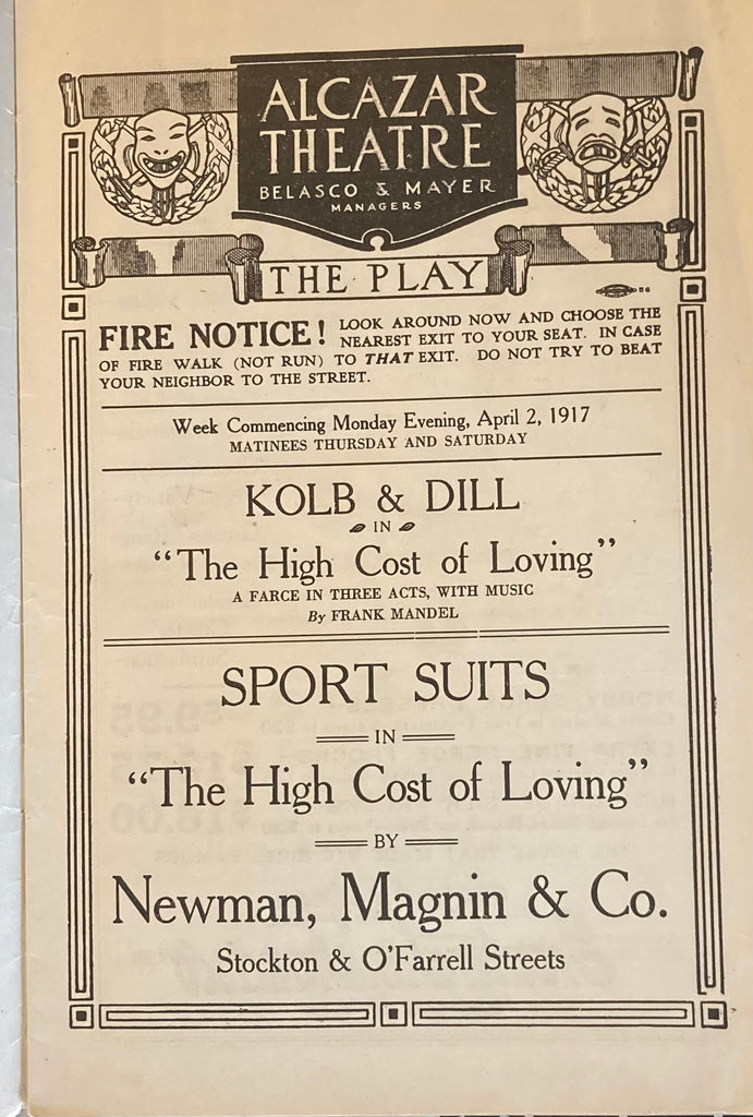 Alcazar Theatre, SF. "The High Cost of Living." April 2, 1917. 8vo. 20pp., prof illust w/ ads inc local restaurants. Illust wraps., Good.