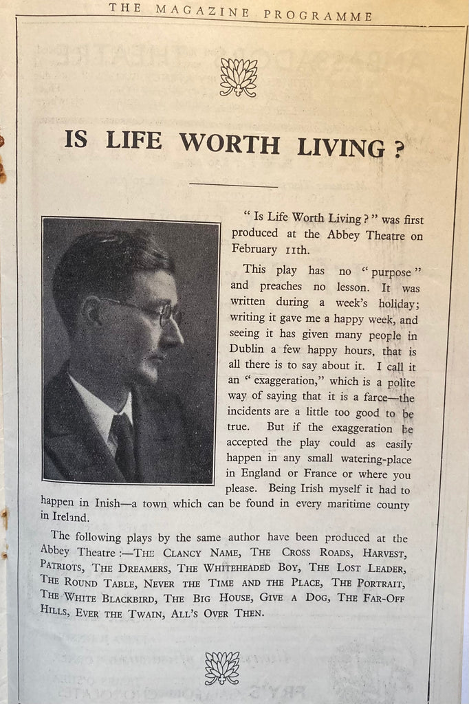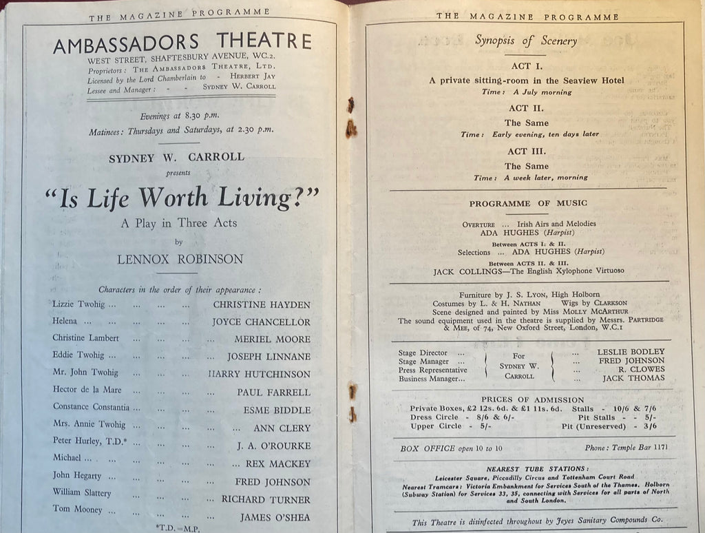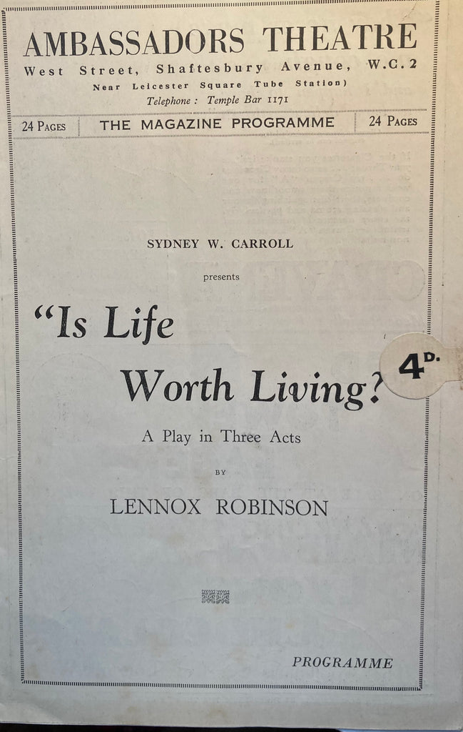 (Lennox Robinson) Ambassadors Theatre, London. "Is Life Worth Living?" Oct. 30, 1933.