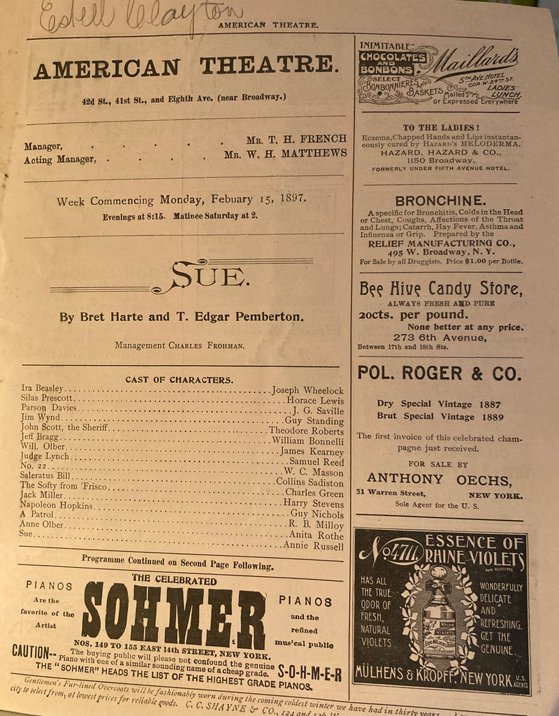 American Theatre, NY. "Sue." Feb. 15, 1897. 4to. 12pp., prof illust w/ ads inc restaurants. Illust wraps, Good.