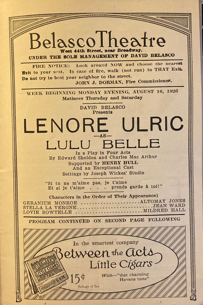 Belasco Theatre, NY. Lenore Ulric starring in "Lulu Belle." Aug. 16, 1926. 8vo. 34pp., prof illust w/ ads inc restaurants. Illust wraps, Good. Controversial play directed by David Belasco; set in San Juan Hill an African American neighborhood in Manhattan. Stars wore blackface.