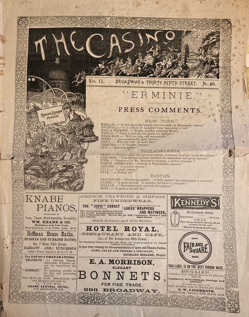 Casino Theatre, NY. "Erminie." Nov. 21, 1886. Folio. 4pp., prof illust w/ ads inc restaurants. Illust wraps, horiz crease, edges chipped, else Fair.