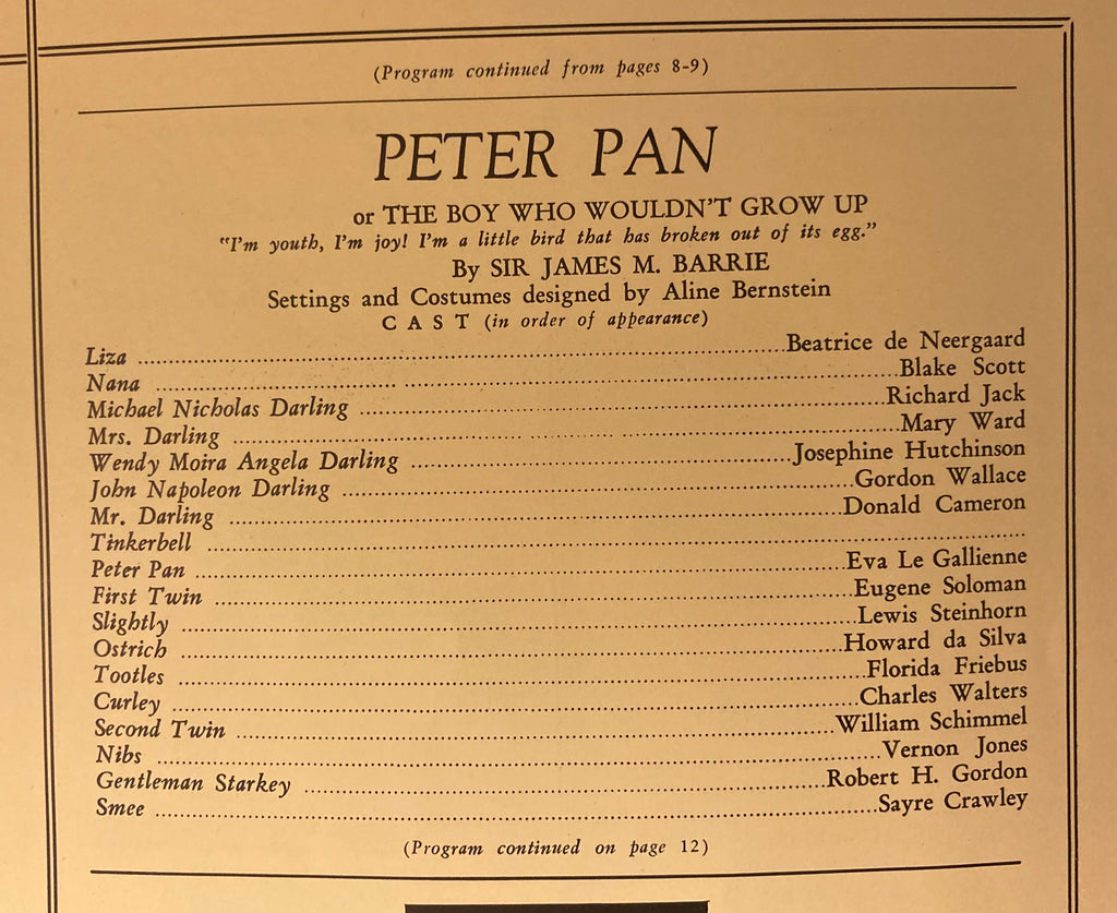 Eva Le Gallienne stars in "Camille." (1928) Lge 8vo. 16pp., listing of the other repertory productions starring Eva Le Gallienne - including  "Peter Pan." A few ads inc local restaurants. Printed wraps, Good.