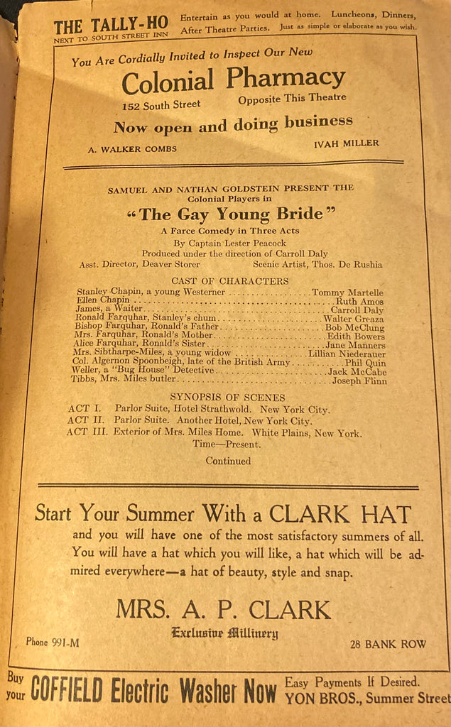 Colonial Theatre, Pittsfield, MA. "The Gay Young Bride." June 25, 1923.