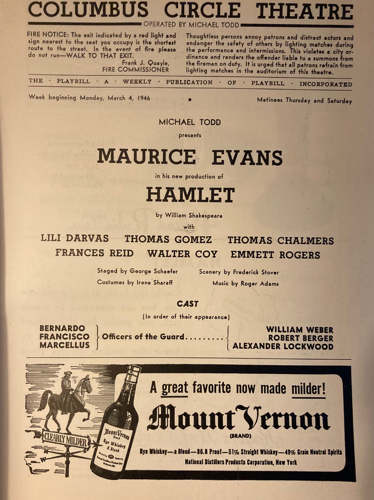 Columbia Circle Theatre, NY. Maurice Evans stars in “Hamlet.” March 4, 1946. 8vo. 24pp., prof illust w/ local ads.  Illust wraps, tiny chips to edges, else Fair+.