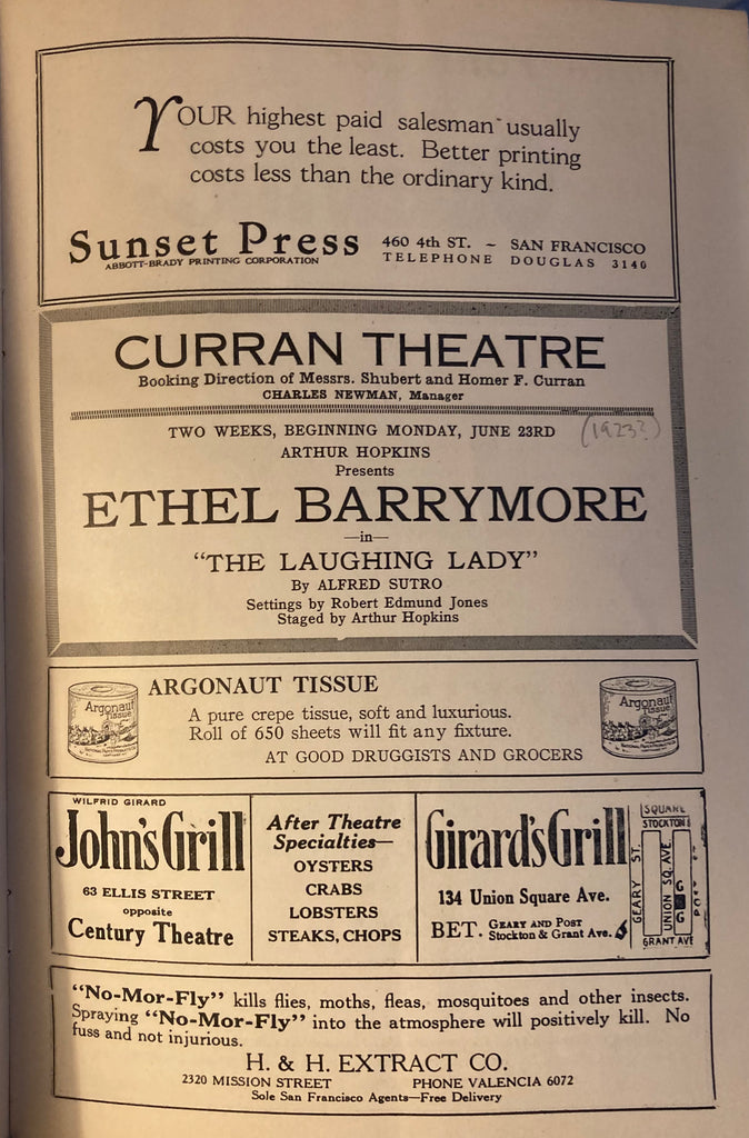 Curran Theatre, SF. Ethel Barrymore stars in "The Laughing Lady." June 26, 1930. Lge 8vo. 32pp., prof illust w/ ads inc restaurants. Color illust wraps, lightly rubbed, else Good. Laid in is the original ticket.