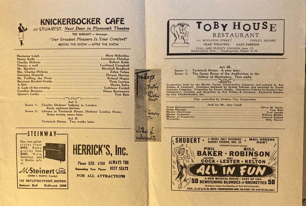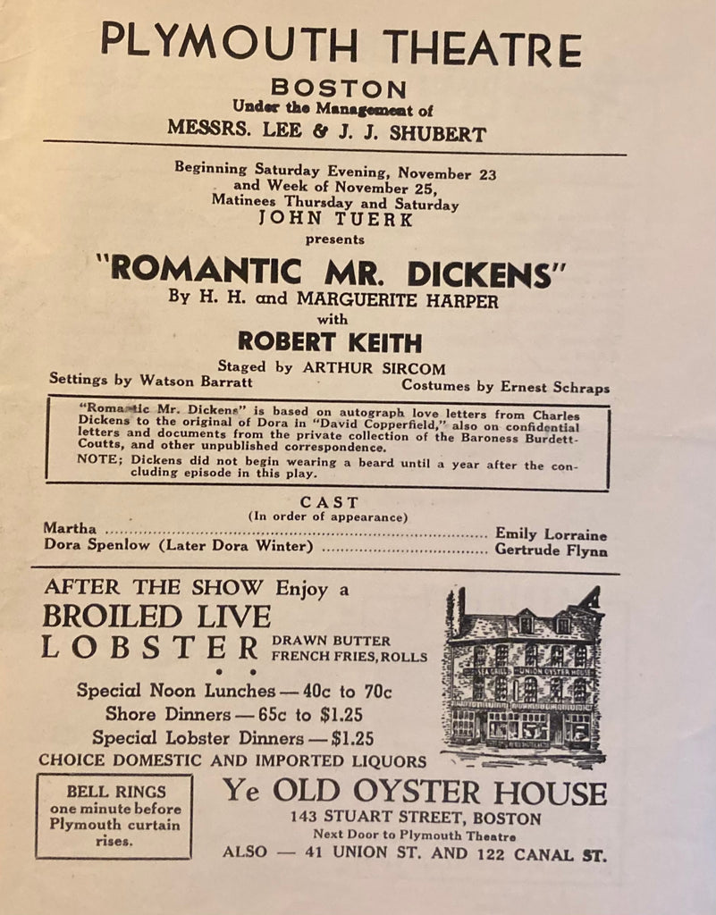 (Dickens) Plymouth Theatre, Boston. Robert Keith in "Romantic Mr. Dickens." Nov. 23, 1940. 8vo. 4pp., ads, inc local restaurants. Printed wraps, Good. Also starring Diana Barrymore.