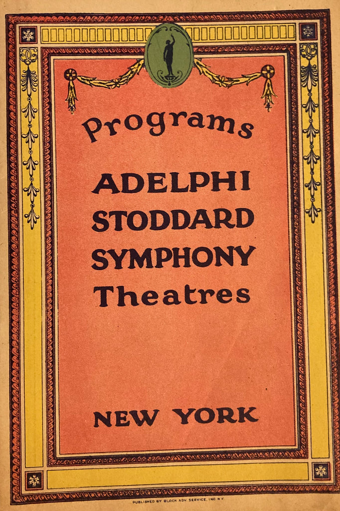 (Early Film) Adelphi Stoddard Symphony Theatres, NY. Four locations including the Stottard Theatre, B'way & 90th St. List of Movies & Showtimes. Nov. 17, 1926. 8vo. 12pp., prof illust w/ ads inc restaurants. Color illust wraps, Good.