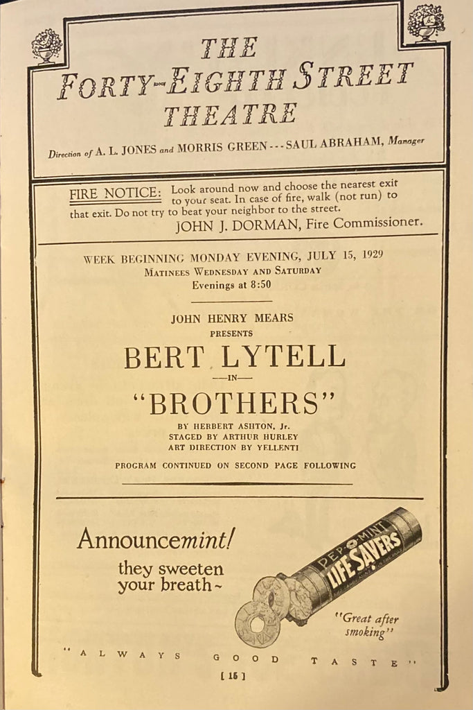 Forty-Eighth St. Theatre, NY. "Brothers." July 15, 1929. 8vo. 24pp., prof illust w/ ads inc restaurants. Prtd wraps, Good.