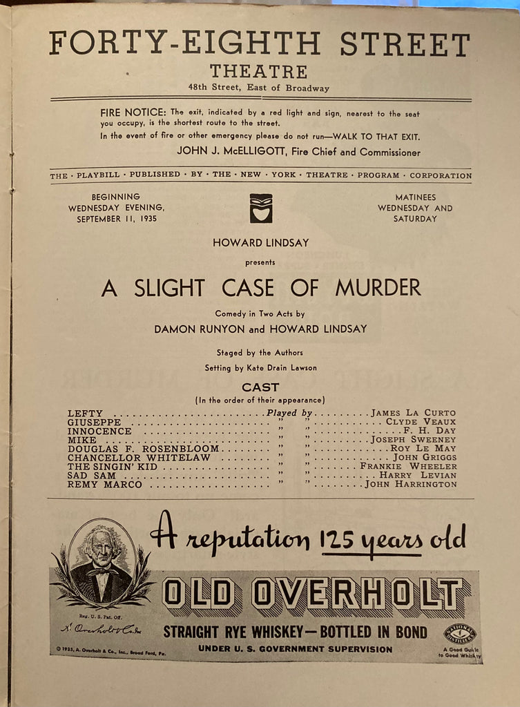Forty-Eighth Street Theatre. "A Slight Case of Murder." Sept. 11, 1935. 8vo. 12pp., lots of ads inc restaurants. Illust wraps, Good. By Damon Runyan & Howard Lindsay.