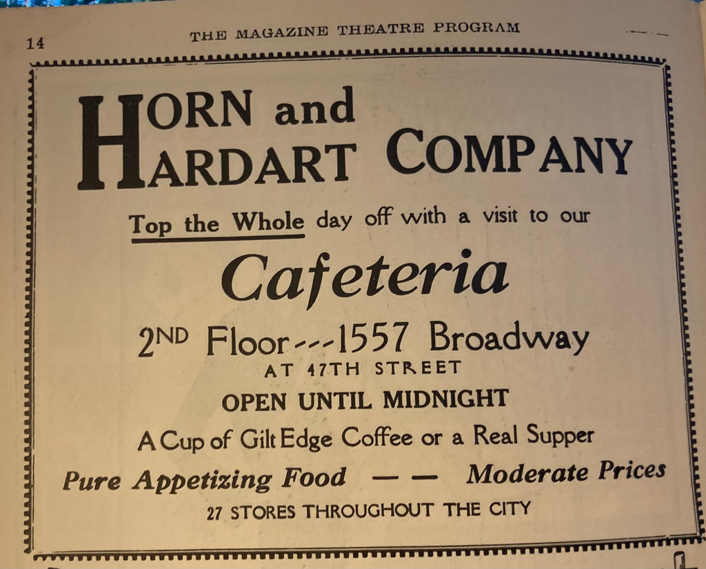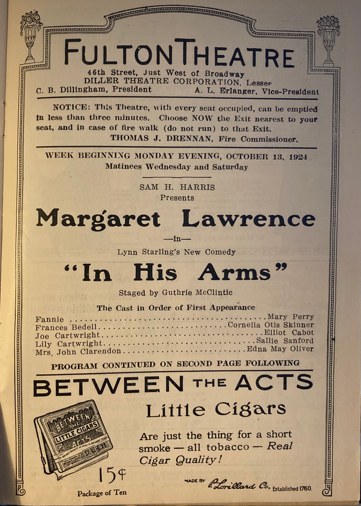 Fulton Theatre, NY. "In His Arms." Oct. 13, 1924. 8vo. 24pp., prof illust w/ ads inc restaurants e.g. Horn & Hardart (!) Color illust wraps, Good. Quite Collectible.