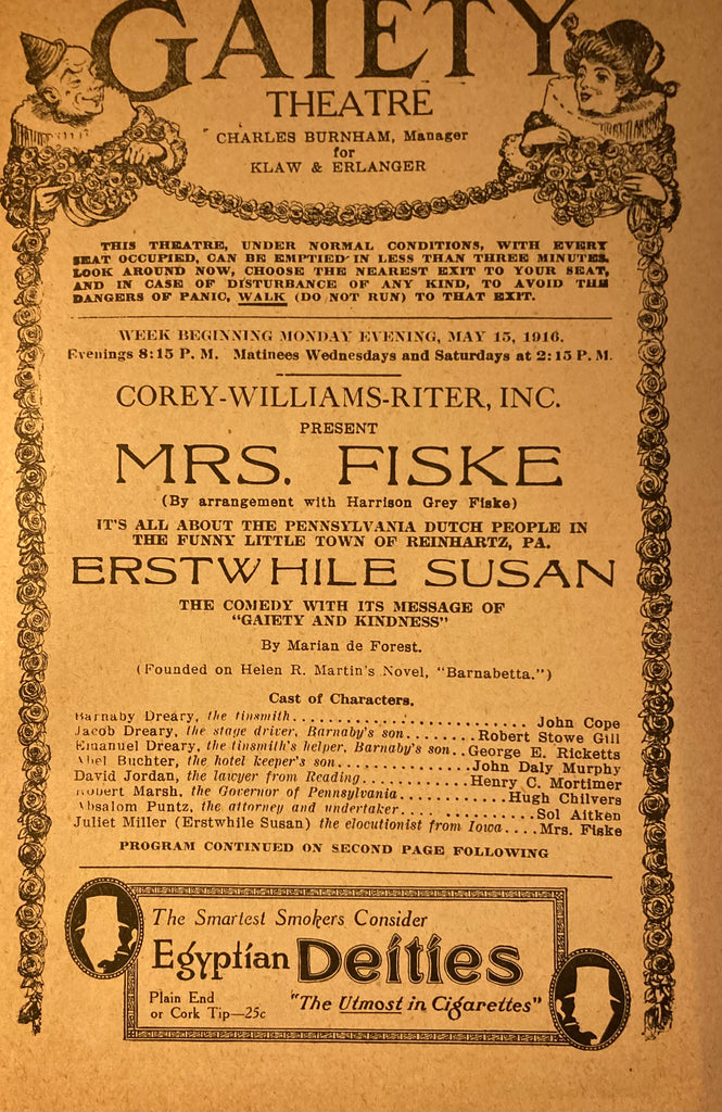 Gaiety Theatre, NY. Mrs. Fiske stars in "Erstwhile Susan." May 15, 1916. Lge 8vo. 14pp., prof illust w/ ads inc restaurants. Color illust wraps, paper embrowned, else Fair+.