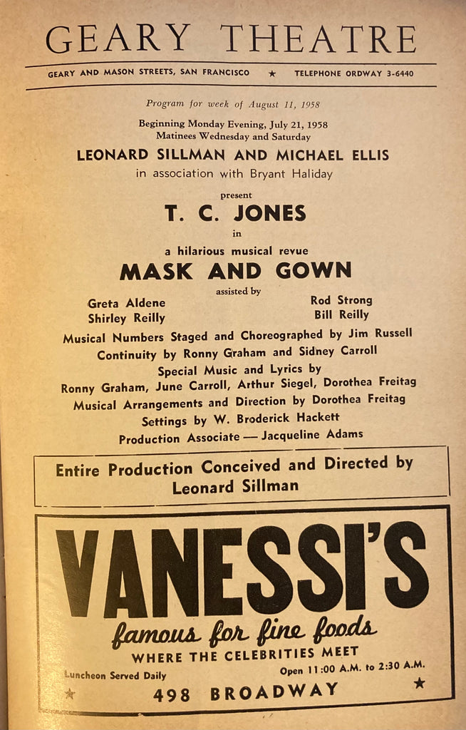 Geary Theatre, SF. T. C. Jones stars in "Mask and Gown." August 11, 1958. 8vo. 32pp., prof illust w/ ads inc local restaurants. B/w pictorial wraps, Good. Quite Collectible. For years Jones was the female impersonator e.g. Tallulah Bankhead, Mae West, Judy Garland, Katharine Hepburn, Bette Davis, Edith Piaf and Carmen Miranda.