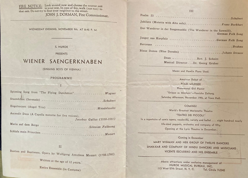 Geo. M. Cohan Theatre, NY. "Wiener Saengerknaben." (Vienna Choir Boys) Wednesday, Nov. 9, 1932. 8vo. 4pp. Program for the evening includes Mozart's opera, Bastien and Bastienne. Illust. wraps., horiz fold, else Good.