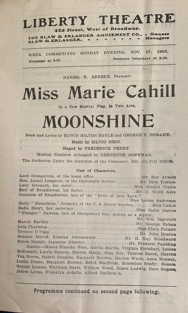 Liberty Theatre, NY. "Moonshine." Nov. 27, 1905. Lge 8vo. 32pp., prof illust w/ ads inc local restaurants. Illust wraps, printed in brown ink. Covers only slightly wrinkled, else Good.