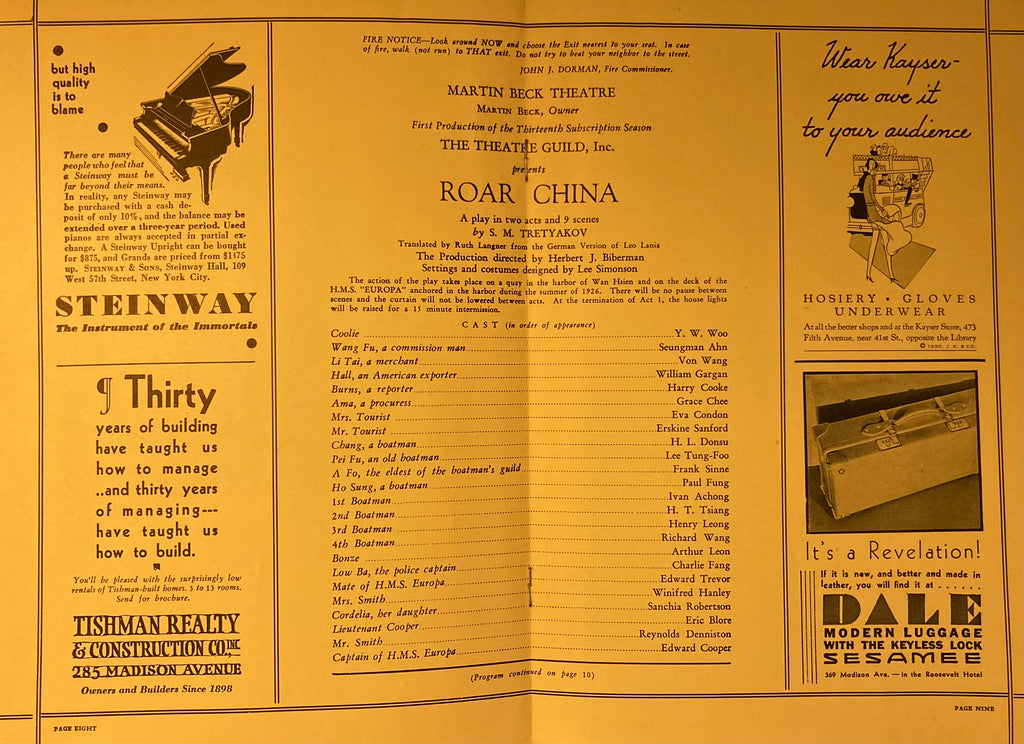 Martin Beck Theatre, NY. Theatre Guild Program. "Roar China." Nov. 24, 1930. Lge 8vo. 16pp. Illust wraps., Good. Starring many Chinese actors.