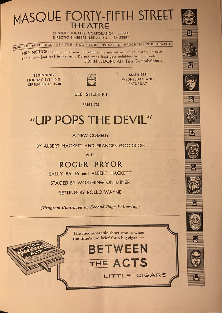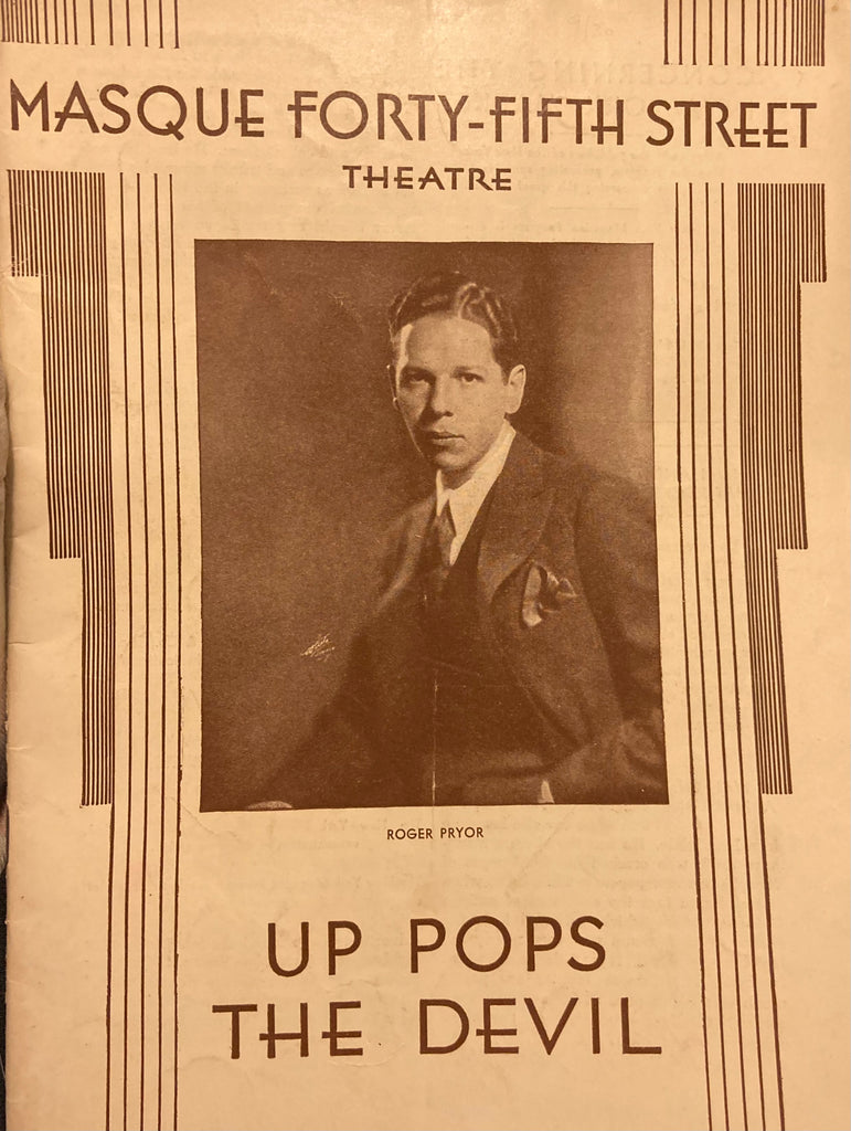 Masque Forty-Fifth St. Theatre, NY. "Up Pops the Devil." Sept. 15, 1930. Lge 8vo. 24pp., prof illust w/ ads inc restaurants. Pict wraps, vertical crease else Fair+. No advertising for alcohol or beer due to Prohibition.