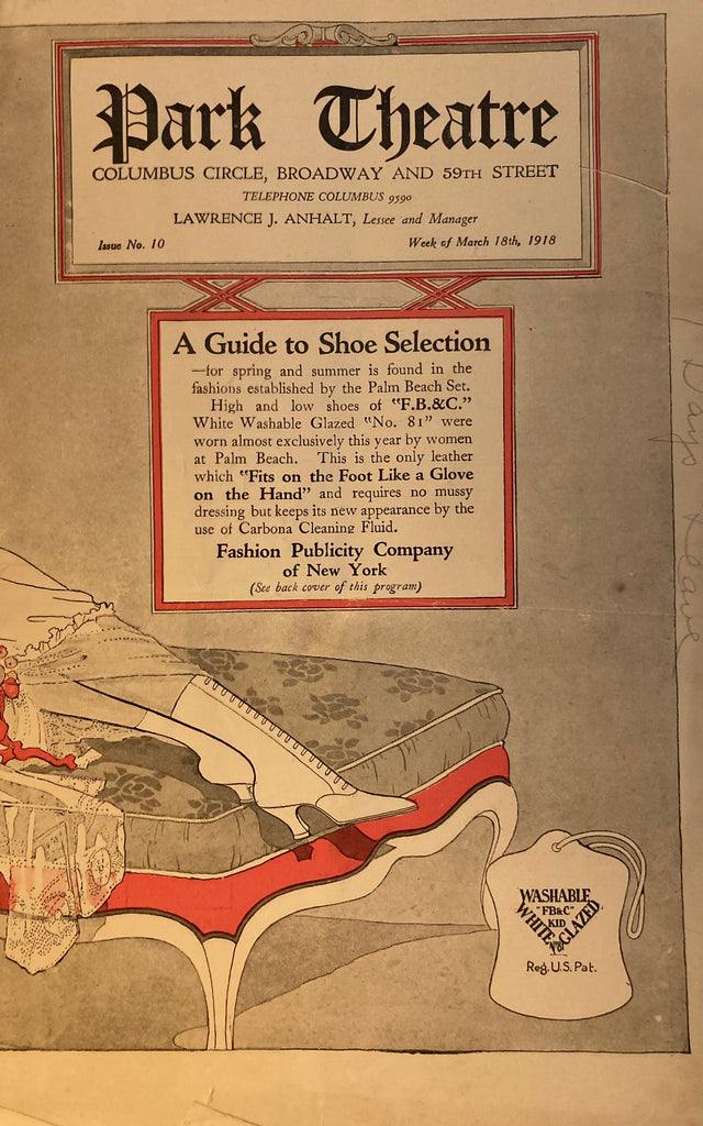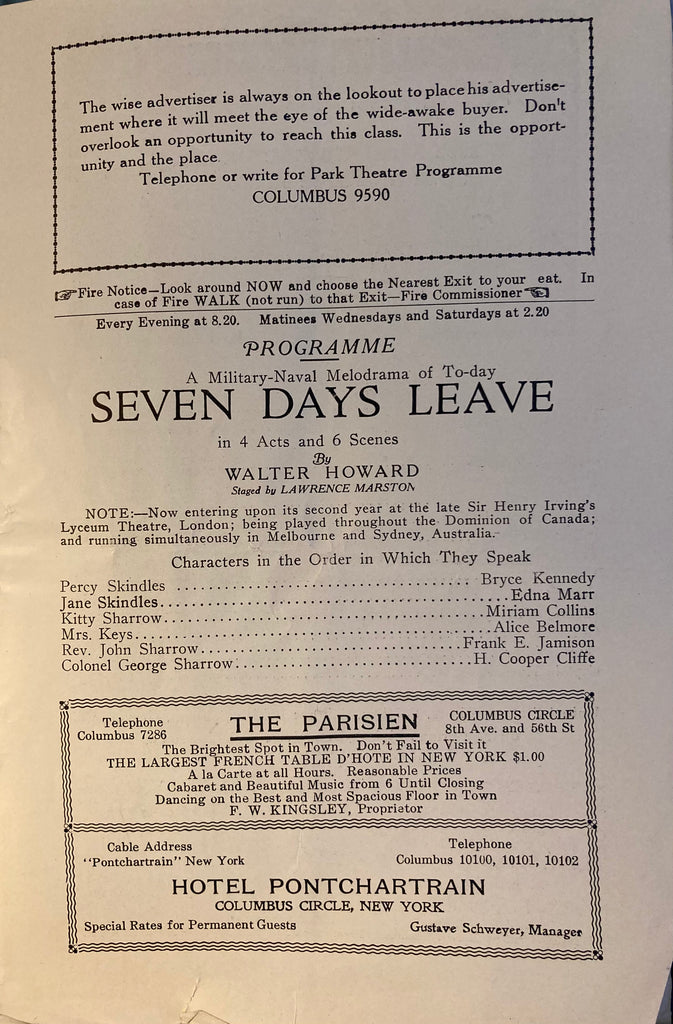 Park Theatre, NY. "Seven Days Leave." March 18, 1918. 8vo. 8pp., lots of ads reflecting WW1 efforts, inc restaurants. Color illust wraps, a few chips to edges, slightly wrinkled, else Fair+.