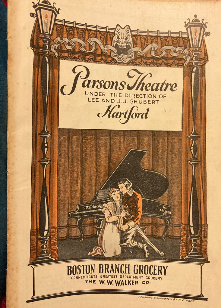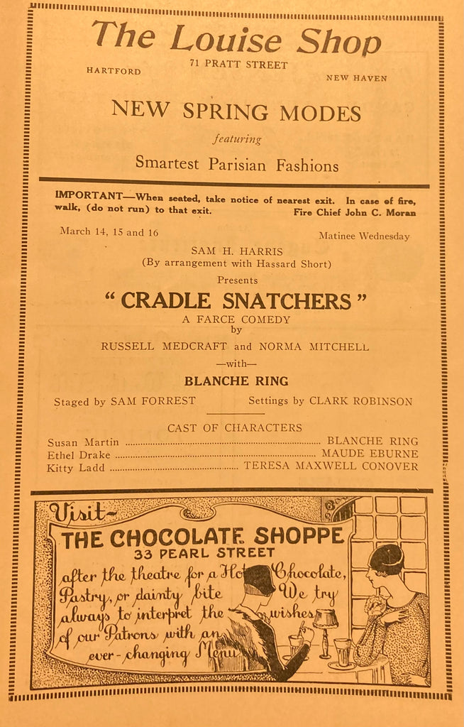 Parsons Theatre, Hartford, CT. Blanche Ring stars in "Cradle Snatchers." March 14, 1927. 8vo. 32pp., prof illust w/ ads inc local restaurants. Color illust wraps, Good.