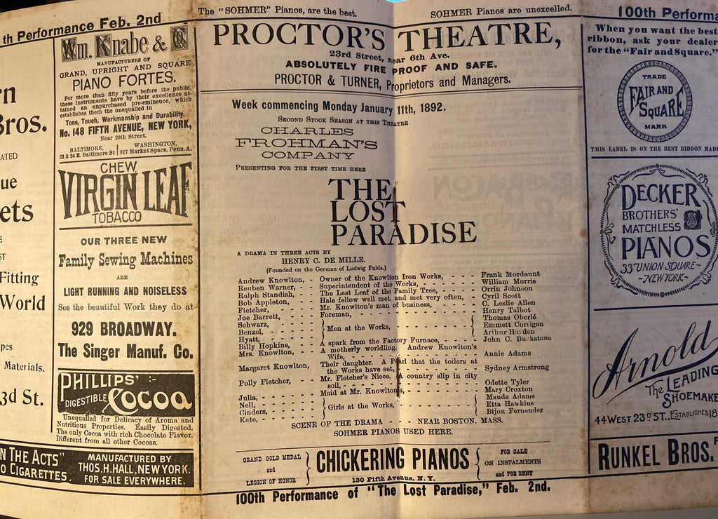 Procter's Theatre, NY. "The Lost Paradise." Jan. 11, 1892. Sq 4to. 16pp., prof illust w/ ads inc restaurants. Illust wraps, Good.
