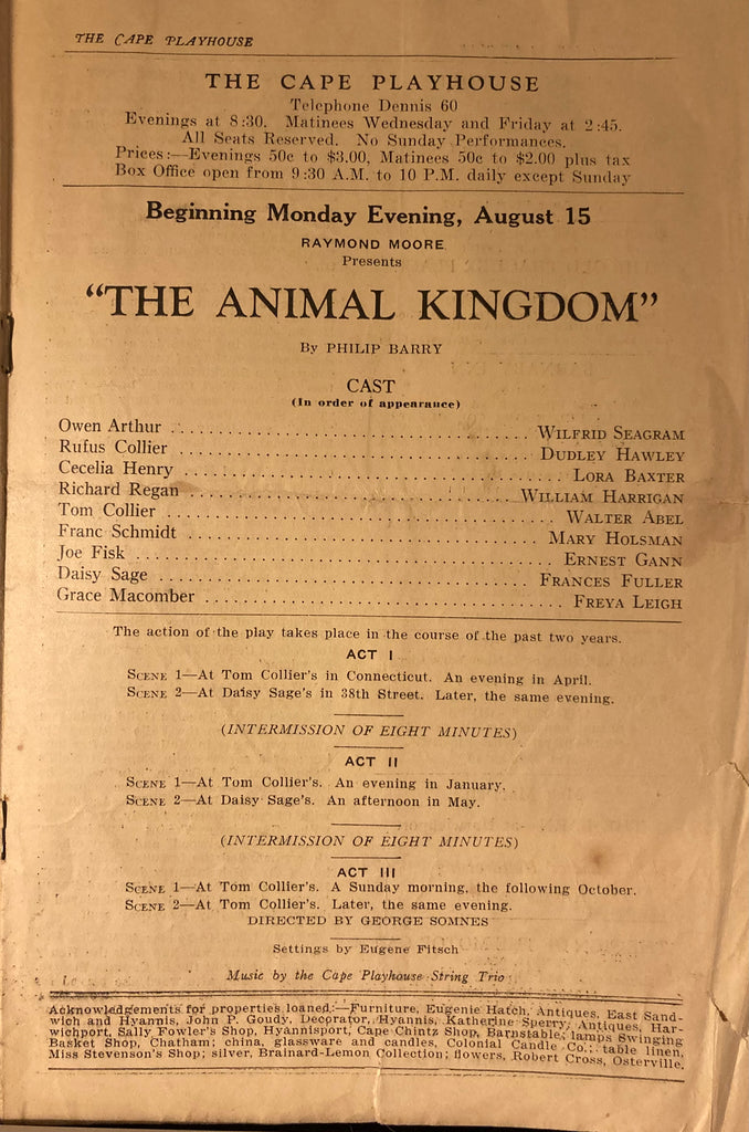 The Cape Playhouse and The Cape Cinema, Mass. "The Animal Kingdom." August 15, 1932. Lge 8vo. 8pp., lots of local ads. Printed wraps, covers lightly stained, tiny tears, else Fair+. Collectible. Includes announcement for upcoming the film, "The First Year" starring Janet Gaynor. The Cape Cinema is known for its beautiful Art Deco architecture, as well as murals by Rockwell Kent.