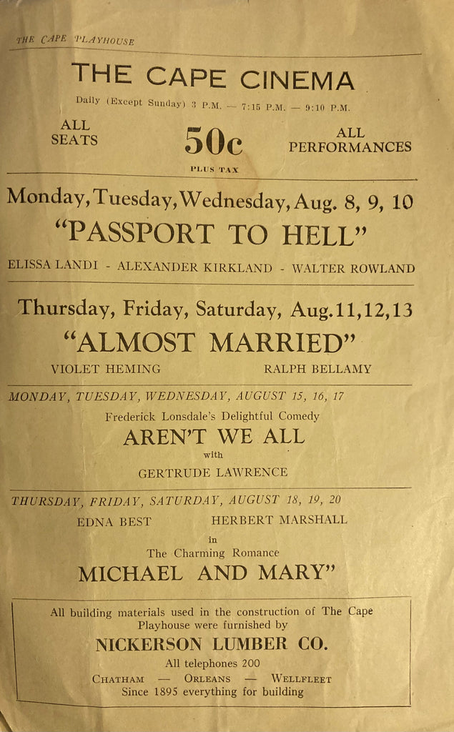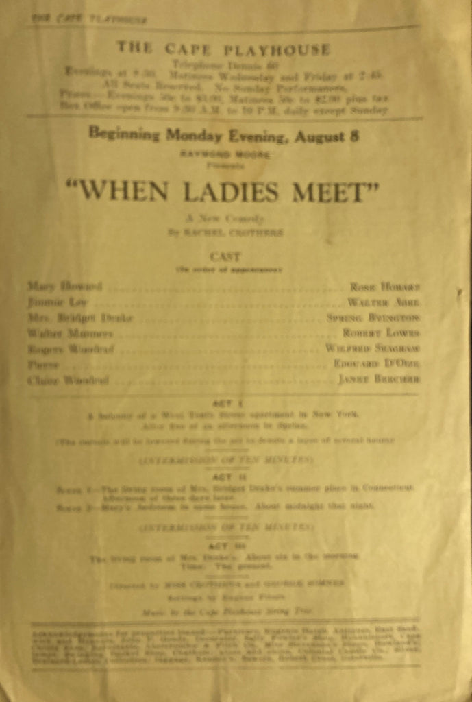 The Cape Playhouse and The Cape Cinema, Mass. "When Ladies Meet." August 8, 1932. Lge 8vo. 8pp., lots of local ads. Printed wraps, covers lightly stained, else Fair+. Collectible. Includes announcement for upcoming the film, "The First Year" starring Janet Gaynor. The Cape Cinema is known for its beautiful Art Deco architecture as well as murals by Rockwell Kent.