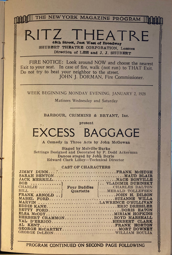 The Ritz Theatre. "Excess Baggage." Jan. 2, 1928. 8vo. 16pp., prof illust w/ ads inc restaurants. Color illust wraps, staples a bit loose, else Fair+. Miriam Hopkins in a minor role.