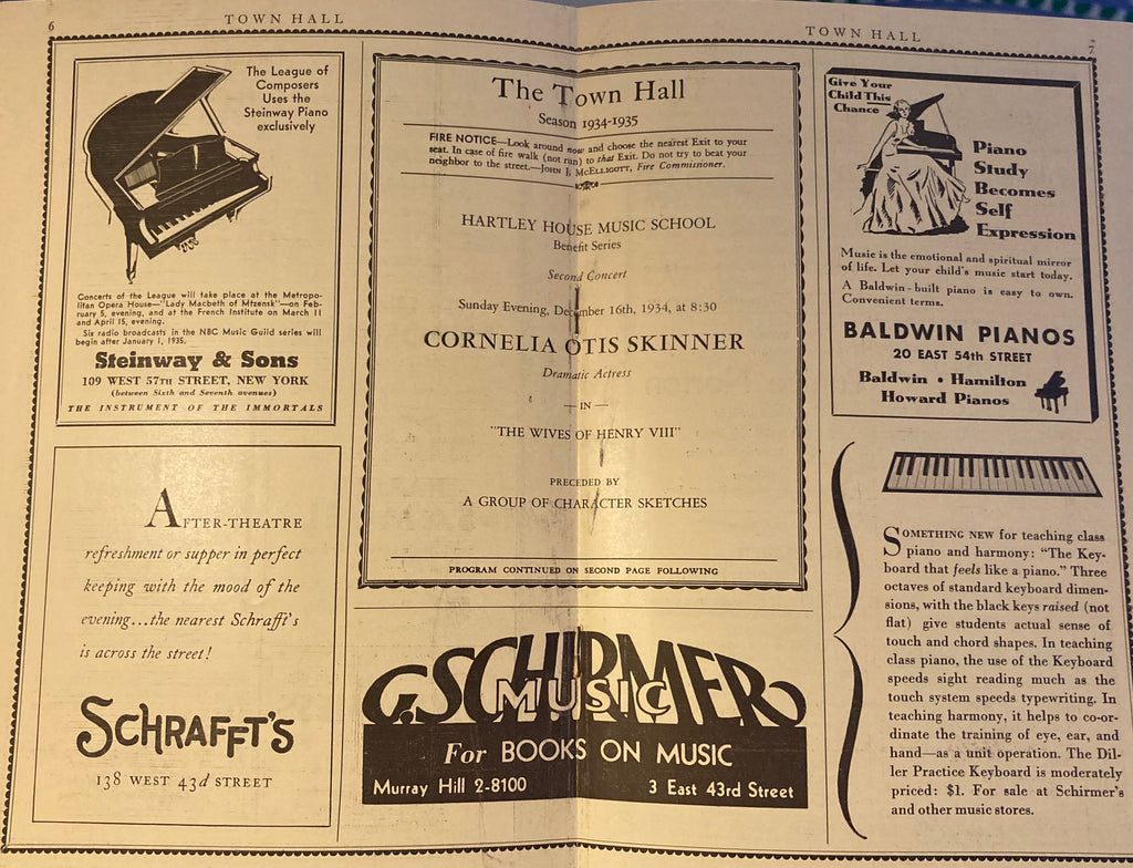 The Town Hall Theatre, NY. Cornelia Otis Skinner in "The Wives of Henry VIII." Dec. 16, 1934. 8vo. 12pp., lots of ads inc local restaurants. Pict wraps, Good. This production was one in a Benefit Series for The Hartley House Music School. Laid in is a 4pp. list of its patrons.