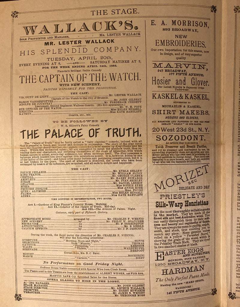 (W. S. Gilbert) Wallack's Theatre, NY. "The Captain of the Watch" followed by "The Palace of Truth." April 20, 1886.