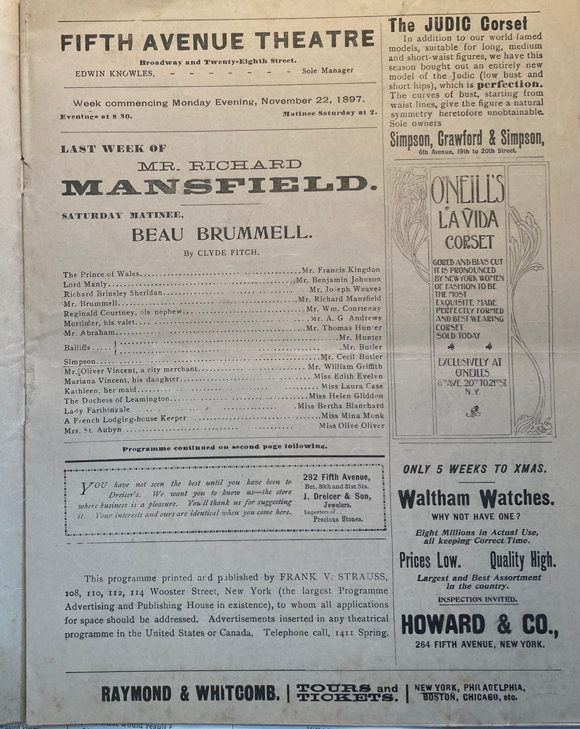 Fifth Avenue Theatre, NY. "Beau Brummel." Nov. 22, 1897.