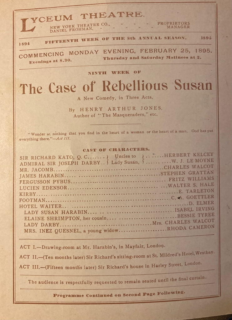 Lyceum Theatre, NY. "The Case of Rebellious Susan." Feb. 25, 1885.