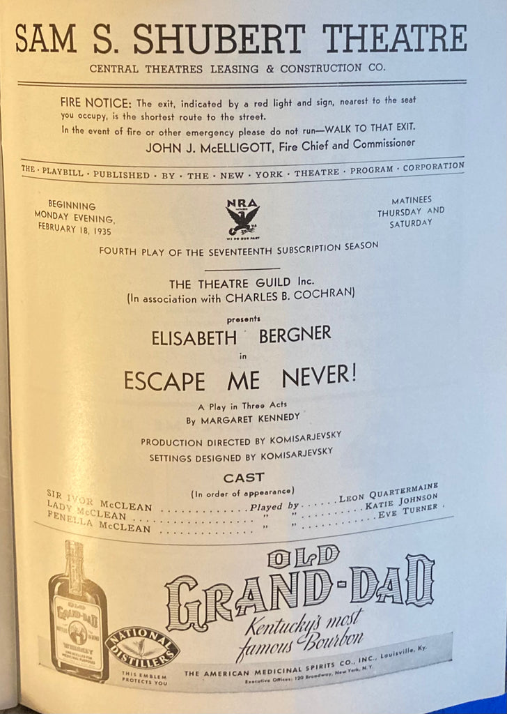 Shubert Theatre, NY. "Escape Me Never!" Feb. 18, 1935.